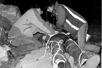 但救援队员发现,他们所处的峡谷底乱石丛生,森林茂密,整个峡谷像一个天然的大铁桶,唯一的出路就是一个向下的悬崖,而且无论是爬上山崖还是爬下山,峭壁的垂直高度都在30米以上。胡某的伤势严重不能再拖延,经过紧急磋商,救援人员决定将胡某传递下山。