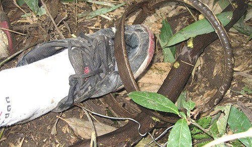 见老吴疼得动弹不得,老杨两人赶紧用钩刀撬野猪夹,但无济于事。两人又砍来青柴,往反方向撬,足足忙活了15分钟,老吴的脚才从野猪夹中挣脱出来。老吴说,尽管他的登山鞋鞋帮又高又厚,可还是被野猪夹夹得底通帮破,脚上鲜血直流。