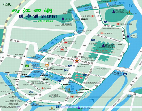 徒步线路:王正功塑像——阳桥——古南门——迎宾桥——丽泽桥——观漪桥——宝贤桥——溪清桥——宝积桥——北门桥——八路军办事处纪念馆——叠彩山正门路口——伏波山——解放桥——象鼻山北门——文昌桥——南门桥——西门桥——少年宫船闸——丽君桥——古榕双桥——阳桥新华书店——日月双塔——知音台
