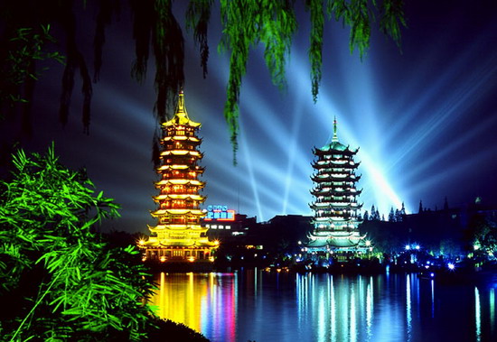 两江四湖是指由漓江、桃花江两条江与杉湖、榕湖、桂湖、木龙湖四个湖泊构成的环城水系。1998年桂林市政府投资数十亿元启动改造景区。景区内遍植榕树、银杏、雪松、水杉、木兰、棕榈等名树。湖面架有名桥19座。名楼、名塔、名亭上万平方米。江湖烟波淼淼,岸畔绿柳依依,山光水色莫不令人感慨万千。入夜灯火璀璨,更是美不胜收,妙不可言。两江四湖真乃天下园林徒步第一线路。