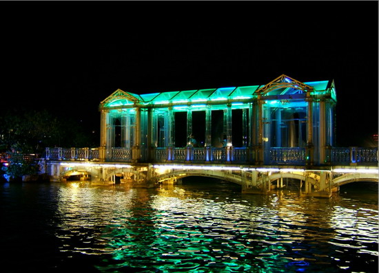 玻璃桥。位于阳桥西侧。桥体采用水晶玻璃制品为建筑构件,体现了现代玻璃工艺的水准,是我国最早采用特种水晶玻璃承重体系的实用性桥梁。桥型造型考究,桥体晶莹剔透。暗夜通过高科技夜景纪光,更显得晶莹澄澈、七彩斑斓。(大桂林精典户外徒步线路图文册)