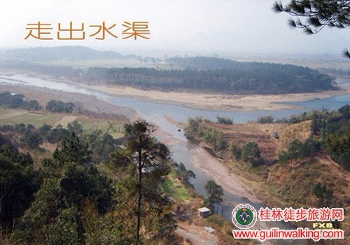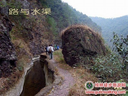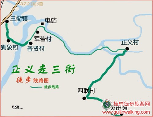桂林七星区屏风市场路口路东进30米,乘开往正义班车——到达正义村,往左路向西出村——沿大路行走不到1公里见农家后顺左边小道行200米便见小溪——走左岸路随溪而去——到达水渠,顺渠而行——行2公里,拐弯处右侧出现开阔石滩,可下滩小歇或午餐——顺水渠行,与溪流高度渐渐拉开,沿水渠行7.13公里(水泥地上一路皆有油漆里程标记)到达峡谷出口——下山包左走过军营村——再走不远是普贤村。上车道——过石桥顺路右转至狮象村——入三街出现两条路,向前向左怎么走都行——来到三街镇街头大马路——“腐败”或乘班车回桂林。