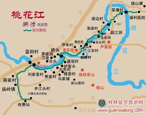 出行方案:乘22路公交车到达终点站桂林市福利医院(注:22路车有两个终点站。视驾驶室玻璃窗上放置的出车牌标注。绿牌终点站是福利院,红牌终点站是福利医院。认准了上红牌车,别乘错。22路公交车情况:起点站天鹅塘,终点站福利医院。首班车凌晨 6:20。线路总长11 公里。站点——天鹅塘、火车南站、汽车站、西门桥头、少年宫、教育学院、信义菜市丽君路、丽泽桥、十字街广场、乐群路口、四会路、宝贤桥、西清湖、观音阁、芦笛路、环城北一路、凤东小区、胜利路三巷口、铁路菜市、铁路小学、铁路医院、矮山塘(铁道部干休所)、福利医院。)——下车后继续前行。顺水泥路至市电控设备厂。左拐——遇花圃大棚。左走——10分钟后见江,右转到达桃花江筌塘村桥——过桥直走。秀峰区甲山乡筌塘村右走过村——10分钟后见左路边有一小纸厂——再走5分钟遇岔路。左走——前方是市第二造纸厂。不到纸厂,右走——数分钟遇岔路。左走水泥道——见到桥。桥对面有块大石碑。这里是南边村。桥叫英江桥——过桥向左,下公路沿江畔田埂上行——1小时后至演波村。这里有两个洗衣取水小码头——遇桥。不过桥。继续走江右——10分钟后达“五仙坝水闸”。闸那边是长海技校。不过闸——行5分钟后走上一片200米长的漂亮绿地。对江的村叫览头村——下一个村是东江村。这里有一座像样的桥,对岸有一座漂亮的亭子——不过桥,穿过马路向上沿山边走不足百米见水渠小桥。过——沿江行500米,见水坝。过坝沿江而行——定江镇聚田村——对江出现的村子是扼脚村。前方200米处有过江水坝。不过江——规模相当大的莲花岩“世纪探古乐园”景区出现。可登山玩耍个够(掌握游玩时间,不宜逗留过久)。原路下山——转过小山头在大路的拐弯处沿左路田间大道重回桃花江畔。走田埂。500米到江边——走1公里,来到临桂镇塔山村委的硚头村——过桥,沿江堤而行——一路宽敞江堤。至道观村——炉家头村——大宅村——熊家村——刘家里村——下江堤。过小桥。走上蓝田大坝。沿公路左走——行1公里至321国道。蒋家村——再行10分钟,到达徒步终点临桂县庙岭镇。可在市场内的聚元饭店“腐败”土鸡土鸭。订餐电话:15907832979——乘路过班车回桂林(12公里,票价3元)。亦可徒步2公里至临桂公路收费站,乘27路公交车回桂林(价1.2元。27路公交车情况:线路总长度12 千米,末班车20:30。起始站点鲁山工业园。站点——玉柴公司、榕山路口、鲁山水泥厂、金水路口、路口村、唐家村、琴潭村、公交琴潭车场、东莲市场、东莲村、黑山路、黑山路口、翠竹路、香江饭店、桂林站、雉山路、雉山路尾、安新小区、穿山桥、辅星路口、漓江东路、三里店广场、朝阳路口、奇峰小筑。)