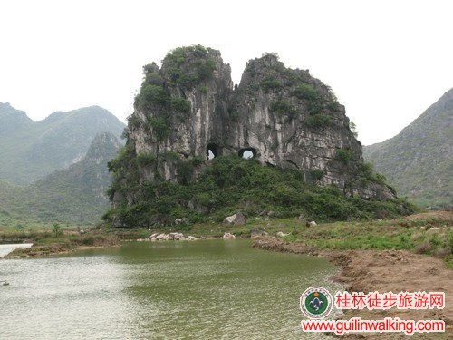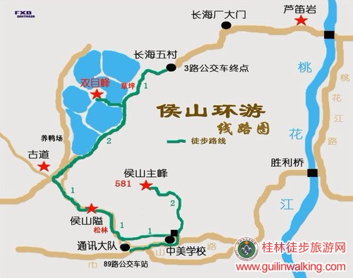 出行方案:市内乘3路公交车至终点站长海五村(13公里1.2元)——五村居民楼,西行至生产区铁栏杆围墙(山在右手边)。右转顺铁栏杆围墙向山的方向行——至墙角处上几级阶梯左转,沿厂区墙外水泥道前行——行至墙角尽头,右上石山道——翻过山去见大片草坪、水塘。下山后水塘前左走——睁着两只明亮亮大眼睛的双目峰在水一方——继续前进走近它。过塘间路百米到达双目山下。可踏着嶙峋的山石向上行,亦可绕过去从背面菜园门移开栏牛羊的荆棘登山。岩洞高20米,三洞一字排开。下山时穿过最西边的岩洞,顺路转过去踩着山石下——返回原水塘入口,继续沿水塘左岸行进——走过最后一个水塘是简易公路。沿公路行百米出现被此路拦腰切断的临桂进城古道。右走临桂,左走桂林。左走——顺宽敞的古道登侯山隘。隘口可见大量残剩下的原古凉亭石块——下隘山窝是一片漂亮的松林。走过松林右路边有一眼长流不断的清泉池水。向前下山便是通讯大队院——不进通讯大队。左走,50米遇变电房,岔路直走过墙门,顺围墙外行300米直达侯山脚——过小石桥左走,走上山路——向上登山。路在溪石、电杆的右边。再向上走,路明显了,走向山顶没有岔路——侯山山势险峻,沿山道曲折而上,山半有乌龟石。上行一段北向西转,经绝险处,再上行,攀七十五度陡坡后转向山背。路左旁边你会看到一眼“侯泉”,或被称为“观音泉”的小小泉水——复上行,钻过茂密的小树林,200米达峰顶,上有金钩岩——登上侯山顶。山顶原电视差转台撤离后长久空置的小屋已被征用。屋顶立起高高的通讯塔。小屋已被锁死不能进。俯瞰桂林城,俯瞰侯山背山水景物。——下山。过石桥左转,沿“中美实验学校”外墙行至大门——200米上大路。右走300米走至通讯大队门前的89路公交车站。乘89路返城(2元)。