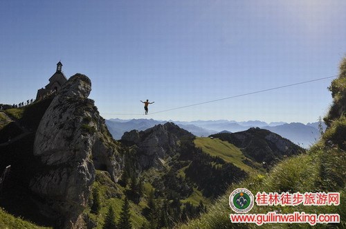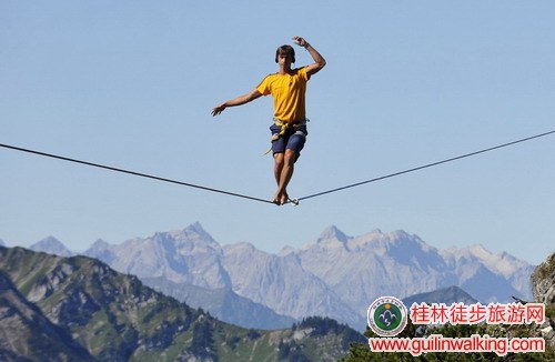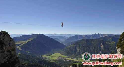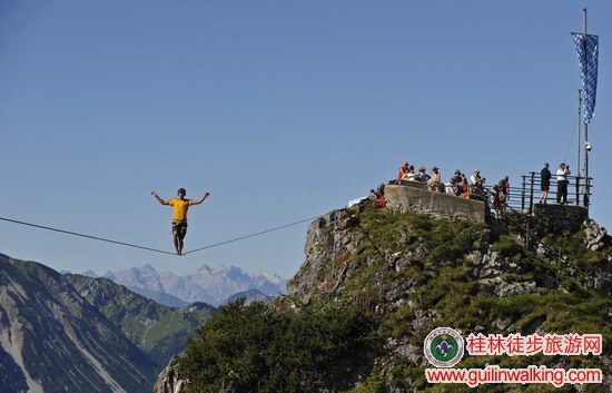 近日,一位世界著名的高空走绳索大师征服了阿尔卑斯山脉中的文德尔施泰因峰。他在这座山峰和旁边另一座山峰之间绑了一根绳索,走过两个山峰之间深达1800米的山谷。在完成跨越长达70米高空距离这一壮举的过程中,他只用绳索将自己的腰部和山谷上方紧绷绳索相连,以张开的双臂保持身体平衡。桂林徒步旅游网 T,Q0w Z%z c!o'o