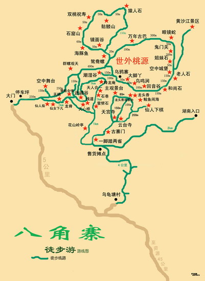 出行方案(2天):(第1天)桂林汽车总站乘资源县班车(114公里19-25元)——资源。乘开往梅溪镇班车(45公里5-8元)——梅溪。乘车至距八角寨大门5公里叉路右拐进简易公路(梅溪转乘柳微车,镇内满街都是,可直接上前讲价)——乌龟圹村下车,从村右小路上山——翻过山头下去后遇岔路左走(有指路石碑)——行2公里过两户民居屋后见岔路,前走——遇岔路左行。沿朝拜石路向山上行——到达山梁,已可见八角寨庙宇房舍。向左拐——转过去,遇摊棚——前行(不要顺右边水泥阶下,这是通往湖南的路)——遇岔路右走(左走是下山出大门的路)——走几步就见到一木牌,上书“一脚踏两省”——前行过山门进入八角寨——可在天宫寺落脚。寺内有客房两间,大木床四张(管理员邓建华一家居住寺内,电话:13878302577)——时间尚早可下山跑一趟湖南,那里一路有不少景点。走法:原路返摊点路口,左沿规范的水泥阶下行。不会迷路——到达湖南出口。小房子旁大门外就是公路。别出去,出去再进来会向你要钱——沿水泥阶上山返回天宫寺——去观景台一带观“鲸鱼闹海”。观险绝天下的“龙头香”。观湖南大地。观日落。