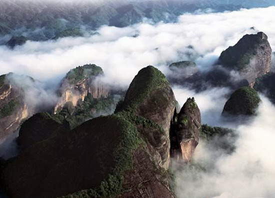 鲸鱼闹海。登上八角寨主峰,进入观景台俯瞰远眺,丹霞美景尽收眼底。但见山峦林立,云浮峰涌,好一幅群鲸戏水、跃海腾洋的画面。这一景观被称为“鲸鱼闹海”。